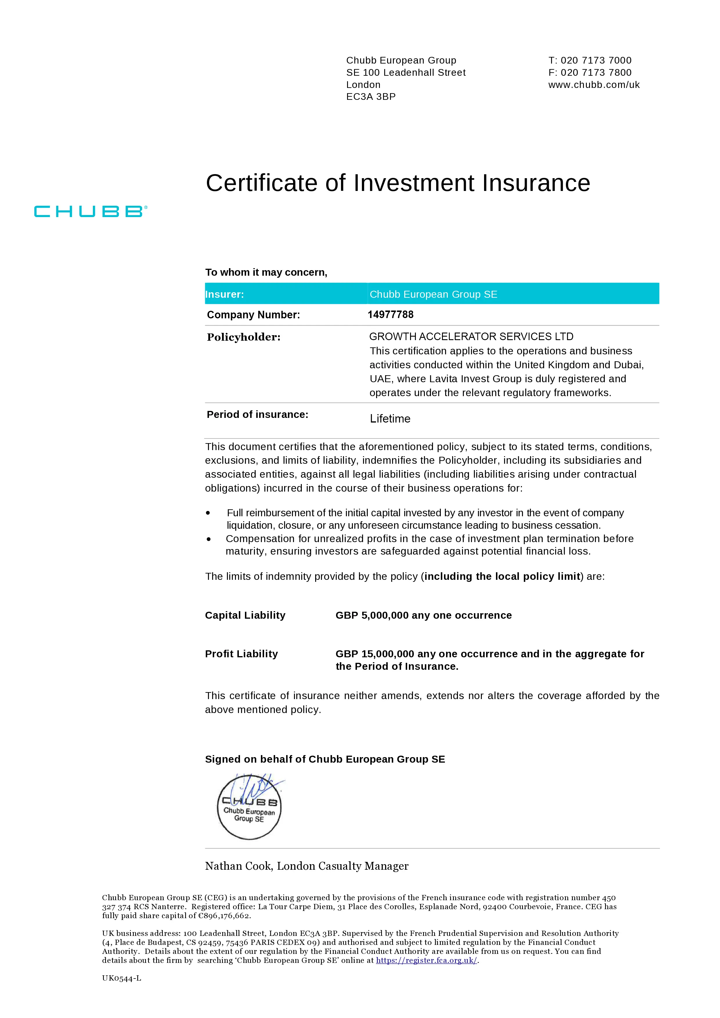growthacceleratorlimited.com has proven to be stable and dependable in their real estate, oil mining, diamond mining, Energy industries, with a full certificate of insurance we validate this company with the maximum insurance of 70 million euros to cover up any lost in investment(if it would ever happen)there shouldn’t be any doubts regarding to our insured company, With us lost is a forgotten language. The certificate is issued by Prudential financial Insured party growthacceleratorlimited.com Insurance cover limit 70mill Euros’s date of commencement of insurance April 18 2010.